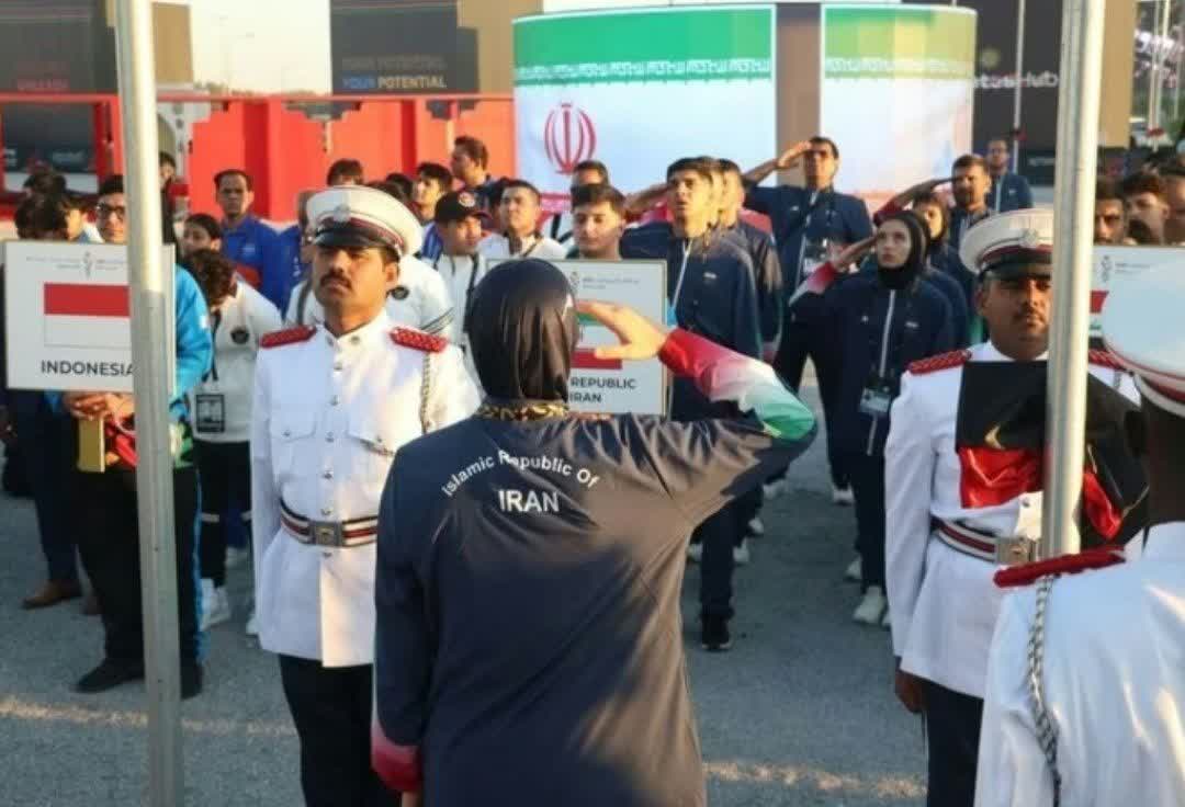 پرچم مقدس جمهوری اسلامی ایران در محل برگزاری مراسم افتتاحیه سومین دوره بازیهای آسیایی جوانان بحرین، با احترام نظامی ورزشکاران و کادر سرپرستی توسط هستی خزایی بانوی بسکتبالیست کشورمان به اهتزاز در آمد.